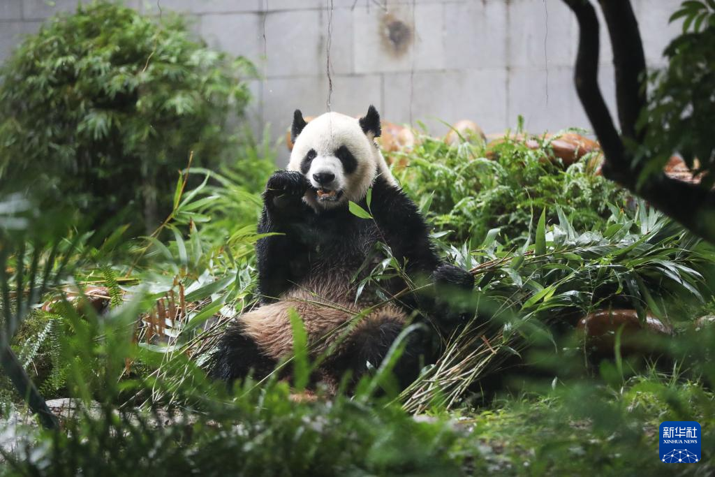 在澳门路环石排湾郊野公园大熊猫馆,中央赠送澳门的大熊猫“开开”“心心”和它们的双胞胎儿子“健健”“康康”过着闲适快乐的生活,它们时而食用竹子,时而与游客“打招呼”,憨态可掬的样子吸引了游客的目光。