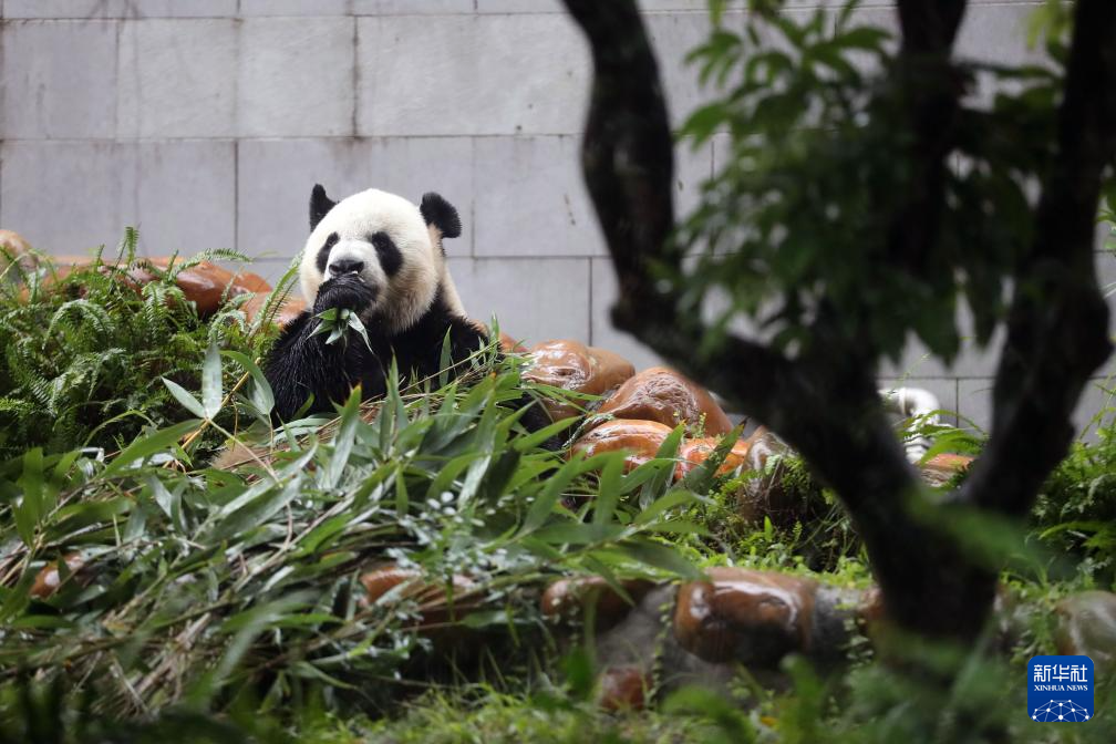 在澳门路环石排湾郊野公园大熊猫馆,中央赠送澳门的大熊猫“开开”“心心”和它们的双胞胎儿子“健健”“康康”过着闲适快乐的生活,它们时而食用竹子,时而与游客“打招呼”,憨态可掬的样子吸引了游客的目光。