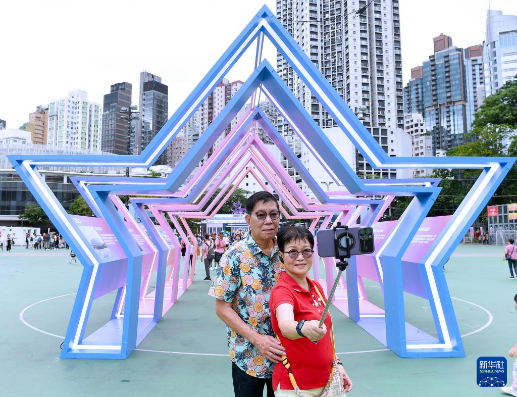 7月1日,市民在香港维多利亚公园“五星隧道”前合影。