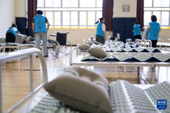 9月23日,避险中心工作人员在澳门塔石体育馆B馆整理床垫。新华社发(张金加摄)